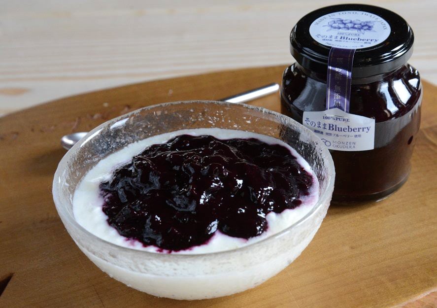 門前おくでら「そのままブルーベリー」は、完熟ブルーベリーの冷凍を無砂糖、無添加物でギュッと濃縮し、ジャムタイプに仕上げています。